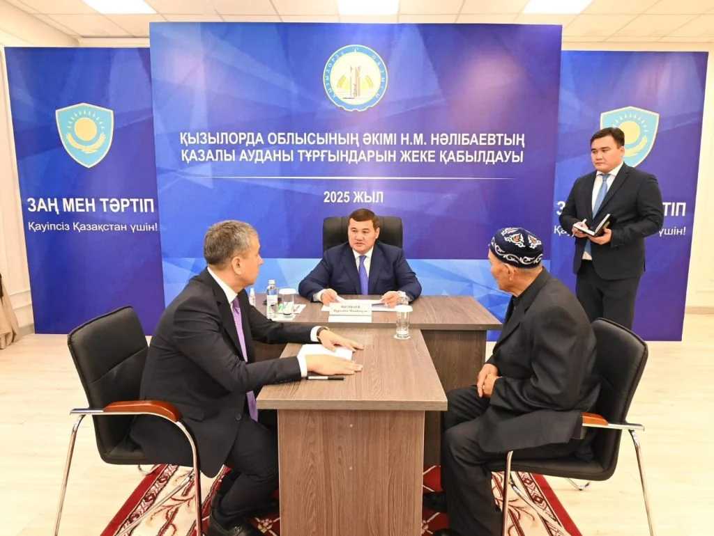 Облыс әкімі Нұрлыбек Нәлібаев құқық қорғау органдарының бірінші басшыларымен бірге Қазалы ауданындағы «Руханият орталығында» тұрғындарды жеке мәселелері бойынша қабылдады.