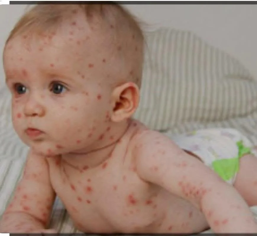 Бірінші күні ауырған баланың бетіне, құлақтың сыртына, мойнына, терінің үстіне көтеріліп теңбіл бөртпе шығады.Екінші күні денесіне шығып, кейбір бөртпелер қосылып ұлғаяды. Үшінші күні бөртпе қолдарына, аяқтарына тарайды. Бөртпе шығып болғаннан кейін аурудың дене қызуы төмендеп жалпы жағдайы жақсара бастайды. Аурудың сауығу кезеңінде бөртпе шыққандағы кезекпен жоғалады да орнында қоңыр дақ қалады. Аурудың клиникалық көріністерінін жойылуы баланың толық айығып кеткендігін білдірмейді, оның организмі әр алуан микробтарға қарсы тұра алмайды.