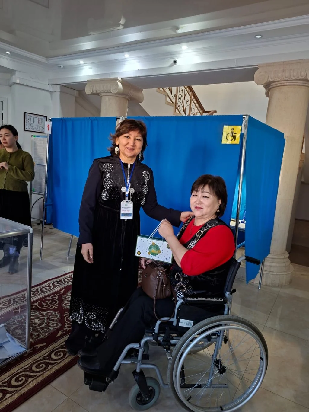 Инватакси мүгедектігі бар азаматтардың учаскеге кедергісіз жетуіне мүмкіндік беріп отыр. Учаскеге келген азаматтарды арнайы қызметкерлер қарсы алып, қажетті көмек көрсетуде. Сонымен қатар, ғимарат ішінде пандустар орнатылып, дауыс беруге арналған арнайы кабиналар қарастырылған. Бұл шаралар олардың дауыс беруіне барынша қолайлы жағдай жасауға бағытталған.